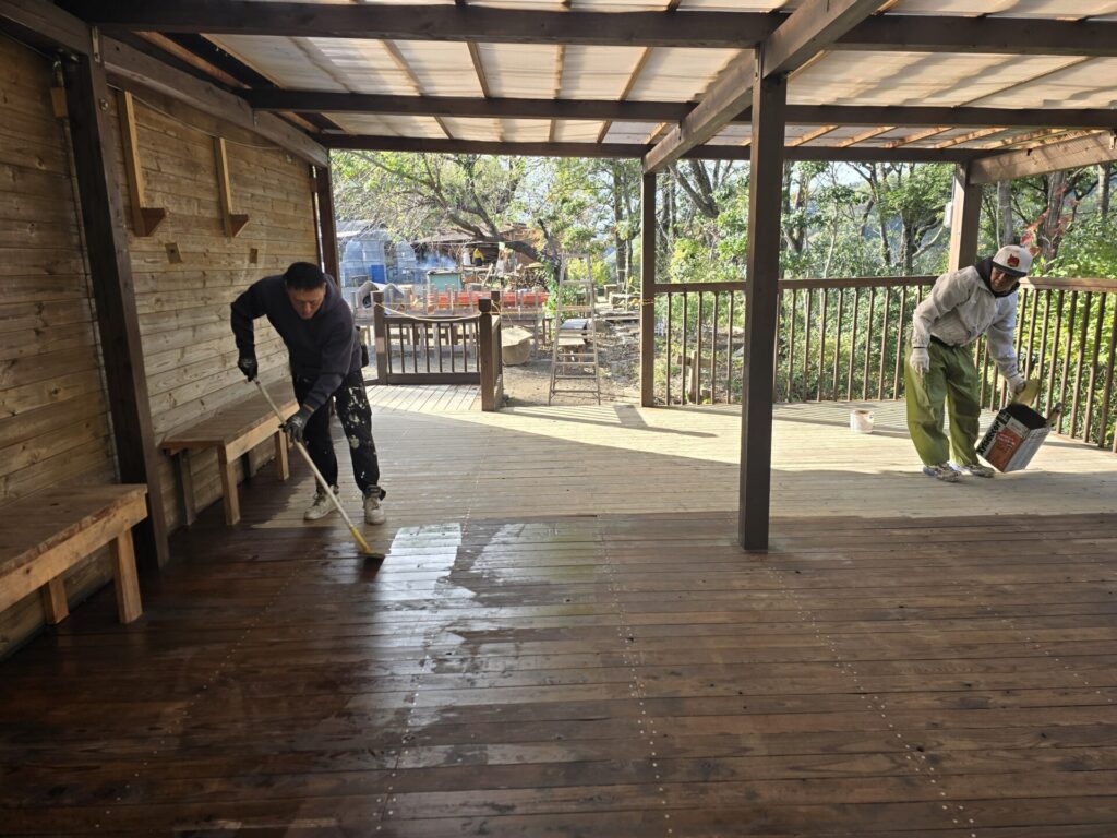ぺちゃくちゃしゃべりながらのペンキ塗り