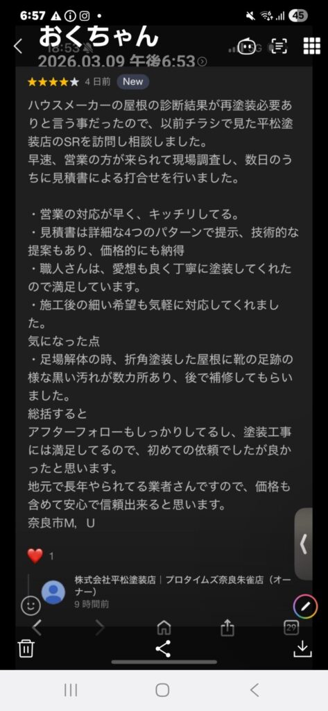 先日、お客様から評価をいただきました