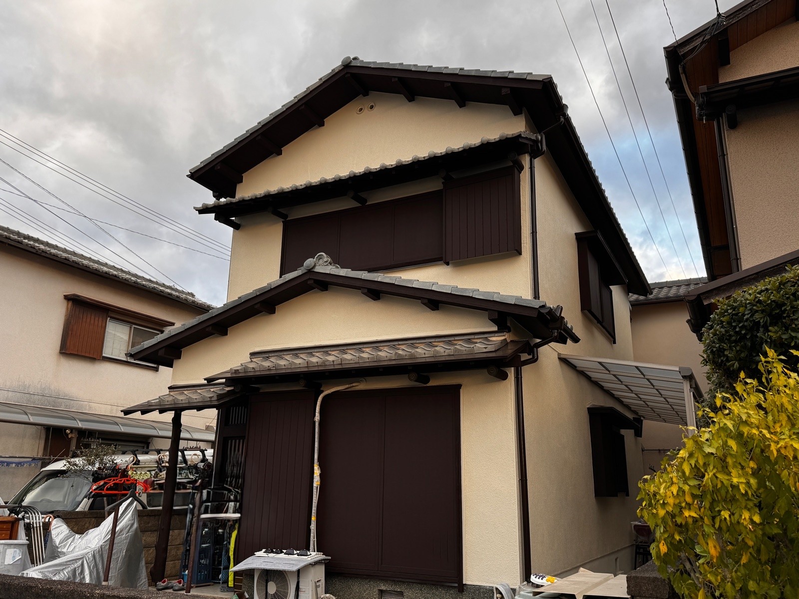 HRI様邸で、外壁塗装、テラス屋根取替工事、ベランダ防水工事をさせていただきました。 以前の落ち着いた印象を踏襲しつつ、外壁にはアステックペイント 超低汚染プラチナリファイン2000Si-IRを使用。 この塗料は、雨だれや汚れが付きにくい「超低汚染性」と、紫外線にも強い「高耐候性」を兼ね備えており、 長期間キレイな外観を保ちたい方にぴったりのグレードです✨ カラーはやさしいベージュ系を選び、付帯部とのコントラストが美しく調和した、上品で重厚感のある仕上がりに。 和風の趣を活かしたまま、明るさと清潔感のある印象を実現できました。 また、テラス屋根の取替工事も同時に行い、使い勝手やメンテナンス性もアップしています。 この度は数ある塗装業者の中から平松塗装店をお選びいただき、本当にありがとうございました!