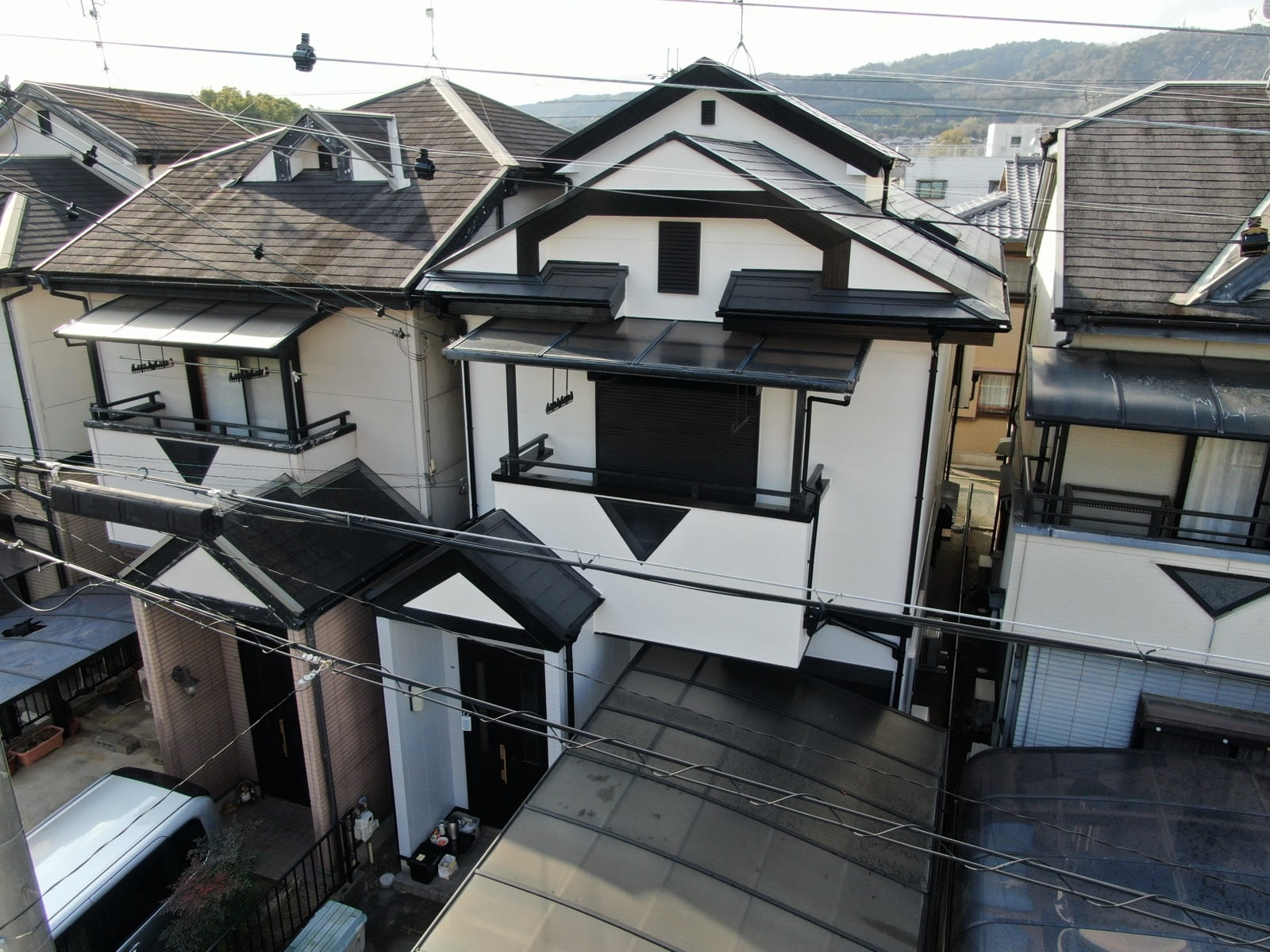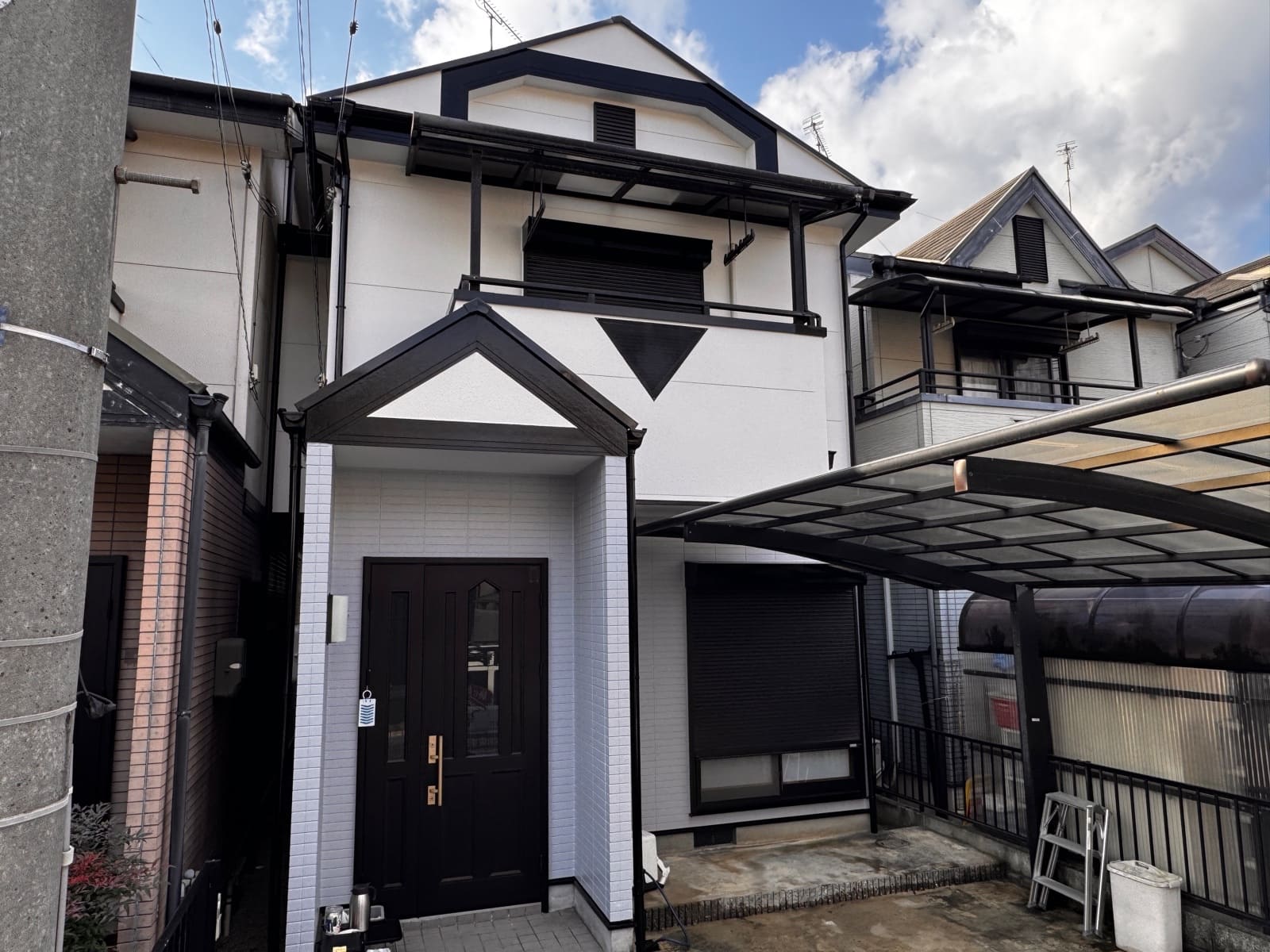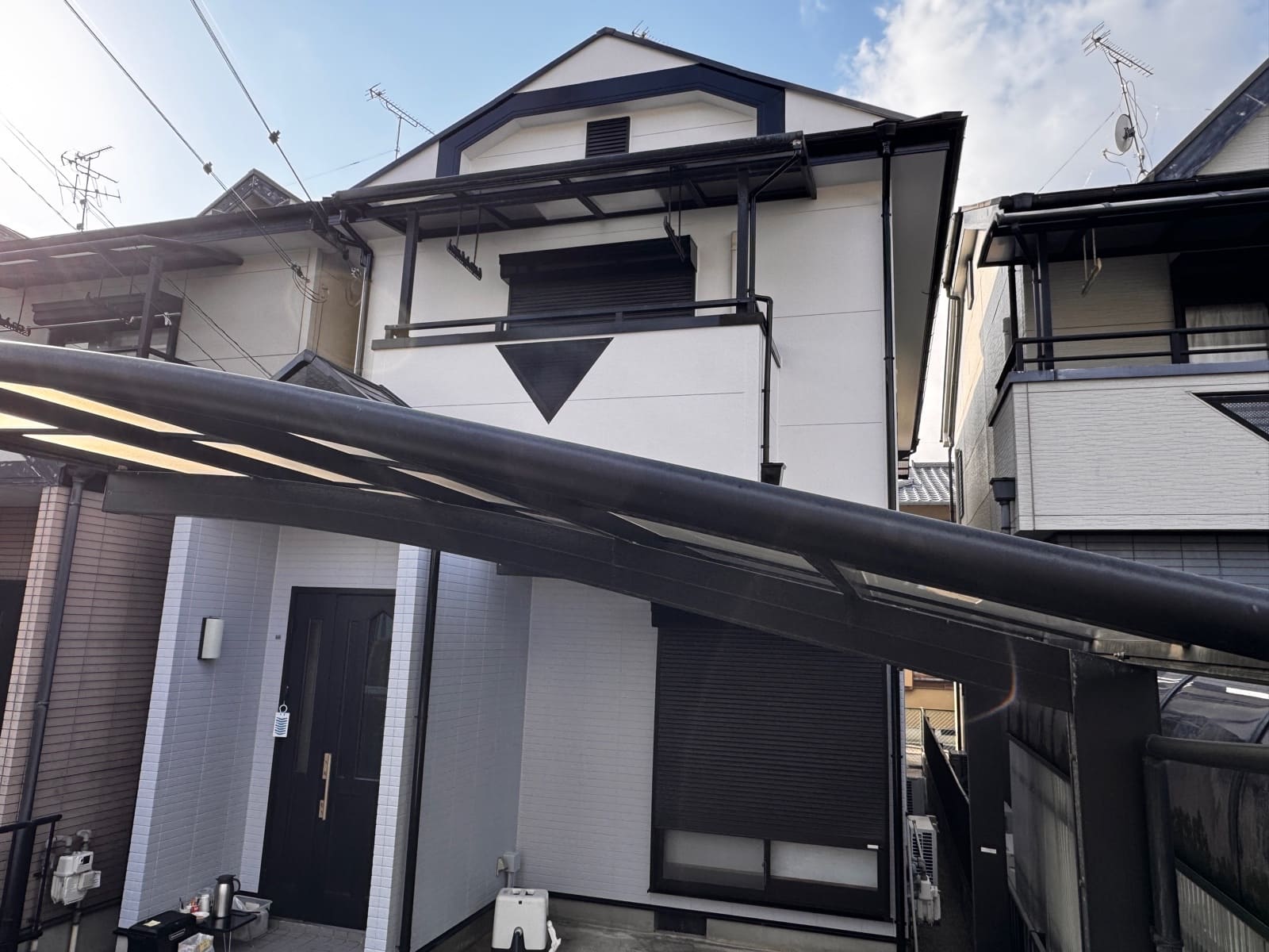 奈良市YMS様邸にて、外壁・屋根塗装工事を担当させていただきました。 今回、外壁には【アステックペイント/プラチナシリコンREVO2000-IR】、 屋根には【AGCコーテック/ボンフロン弱溶剤エナメルGT-SR】を使用し施工させていただきました🏡✨ 施工前は、全体的に経年による色あせやくすみが見られ、やや重たい印象になっていました。 今回の工事では、ホワイトを基調にブラックのアクセントを効かせた コントラストのはっきりした配色に仕上げることで、外観がぐっと引き締まり、 スタイリッシュで存在感のある住まいへと生まれ変わりました。 外壁に採用したプラチナシリコンREVO2000-IRは、高い耐候性と低汚染性を兼ね備えた塗料です。 紫外線や雨風から外壁を守りながら、美しい色合いを長期間維持できるのが特長です☀️ また、屋根にはフッ素樹脂塗料であるボンフロン弱溶剤エナメルGT-SRを使用。 耐久性・耐候性に優れ、色あせや劣化を抑えながら、均一で美しい艶のある仕上がりとなりました。 建物全体の防水性・保護性能も向上しています🔧 今回の塗装工事により、見た目の印象だけでなく、建物の機能面もしっかりと強化されました。 YMS様、このたびは数ある塗装店の中から平松塗装店にご依頼いただき、誠にありがとうございました。 今後とも末永いお付き合いをよろしくお願いいたします。